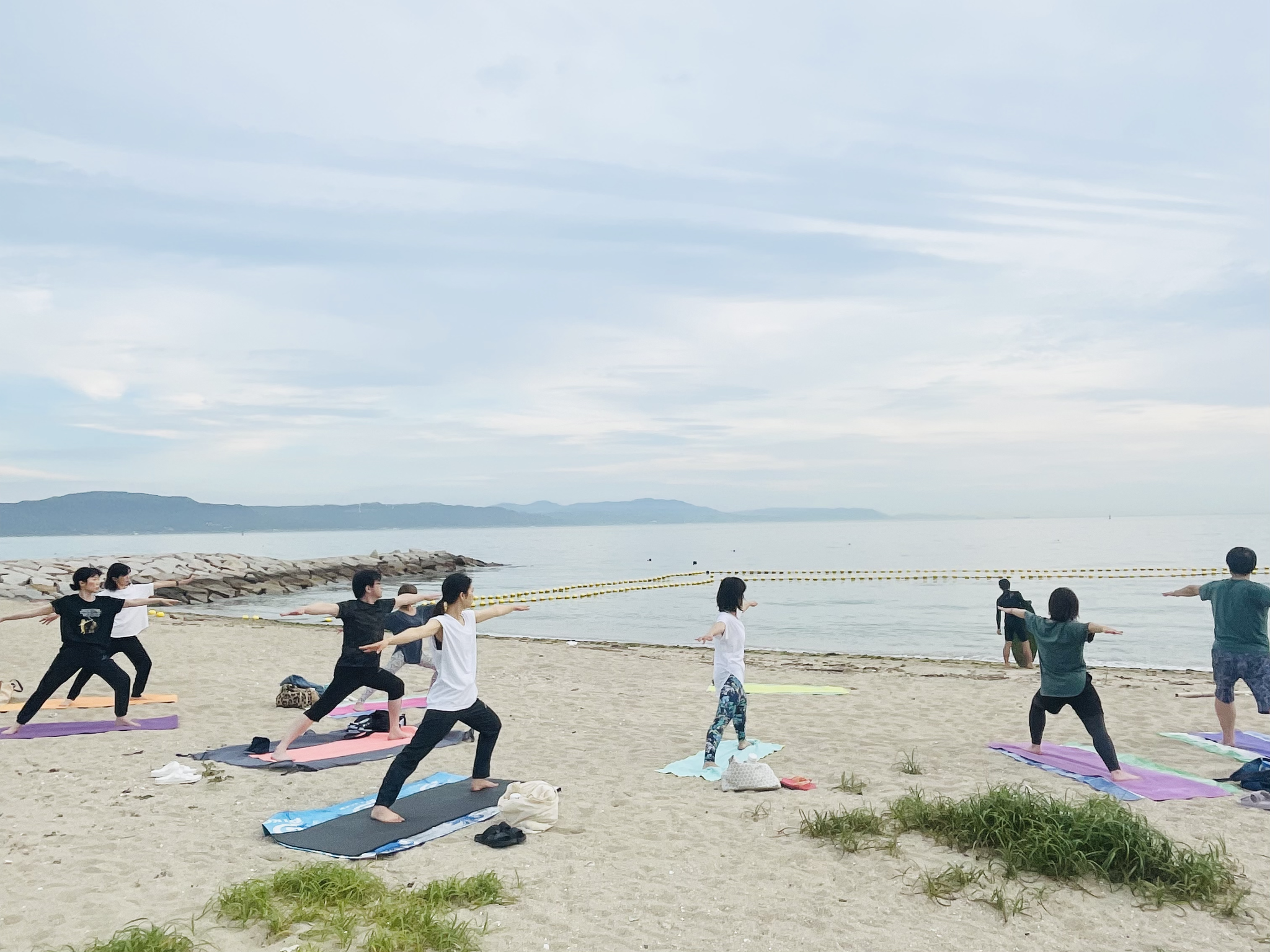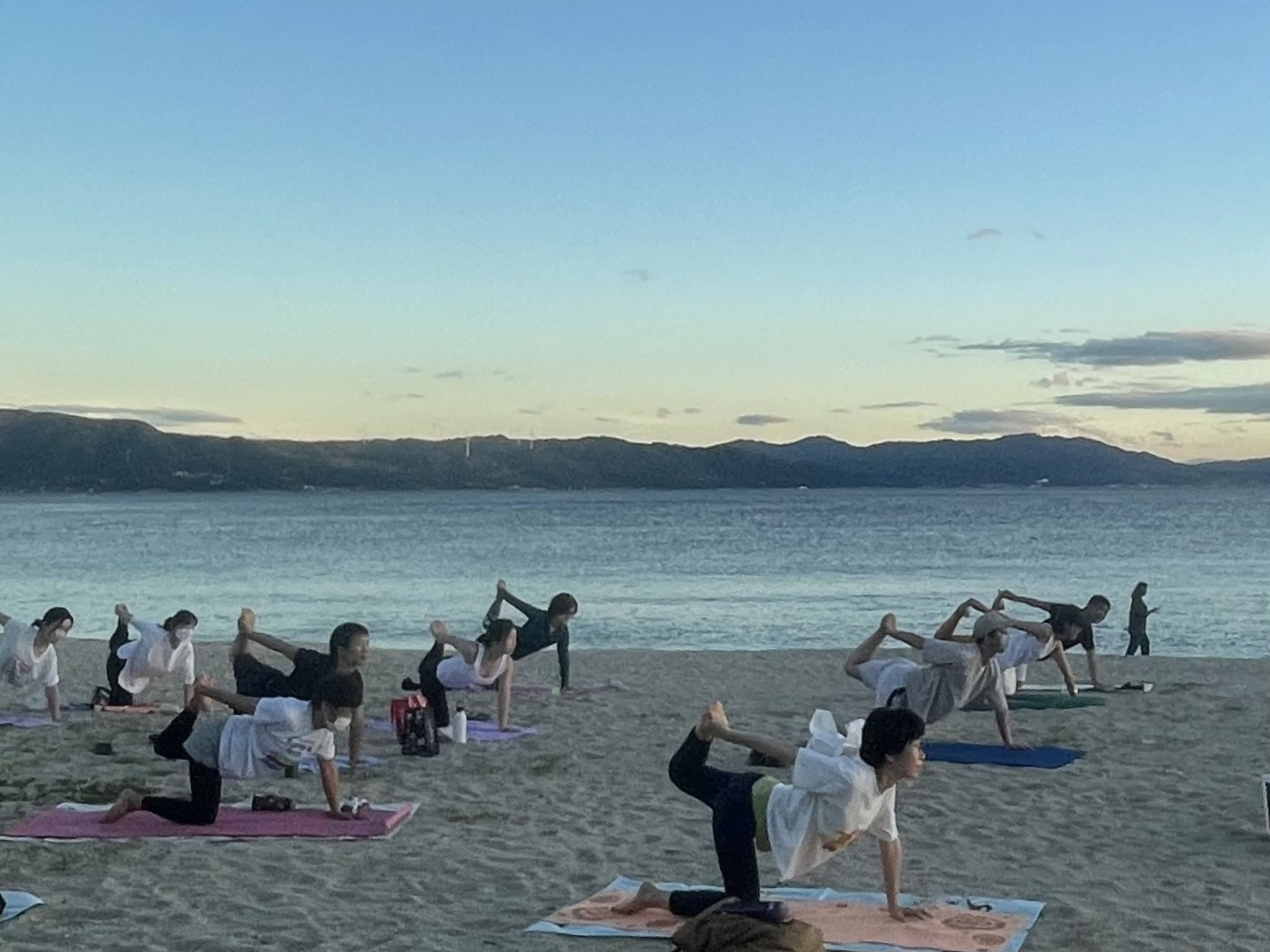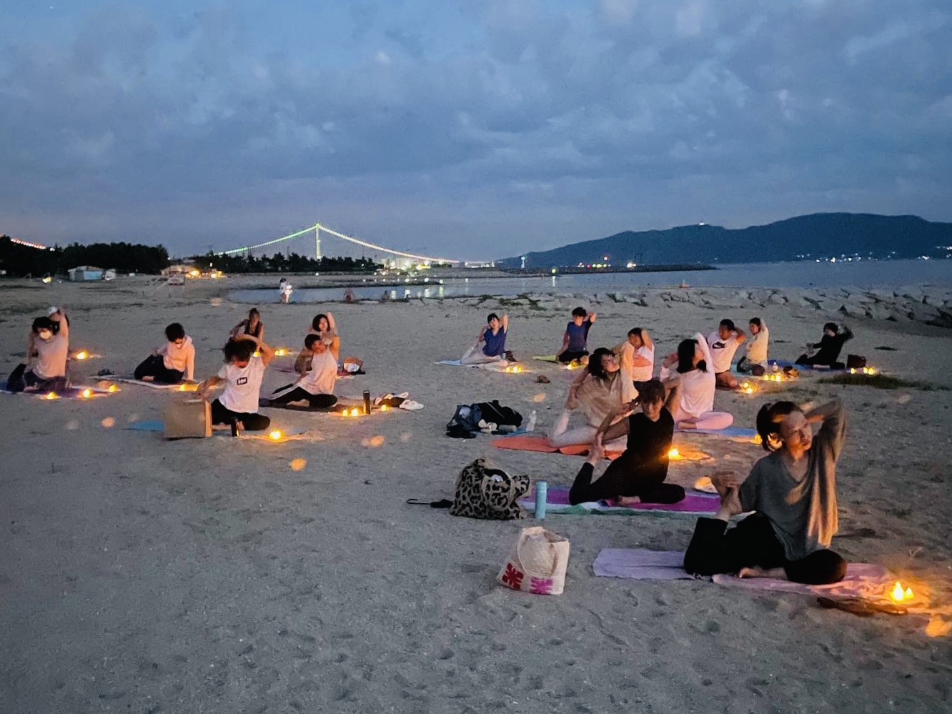 対岸に淡路島、東に明石海峡大橋がある広大なロケーション。白い砂浜が続く見晴らしの良いビーチ、波の音を聴きながらおこなうヨガは、開放感にあふれます。時間により変化していく景色をお楽しみいただけます。