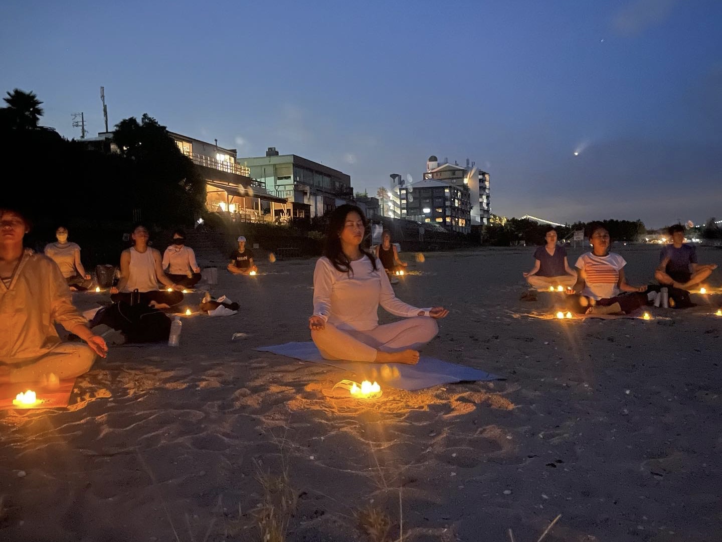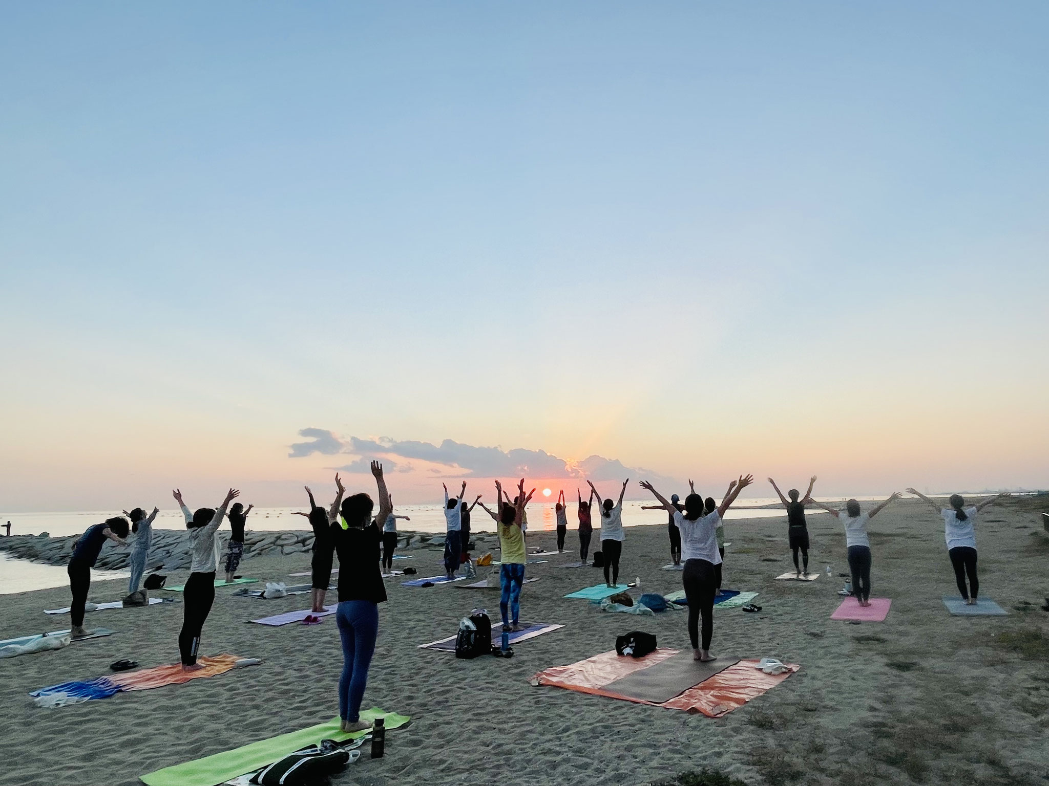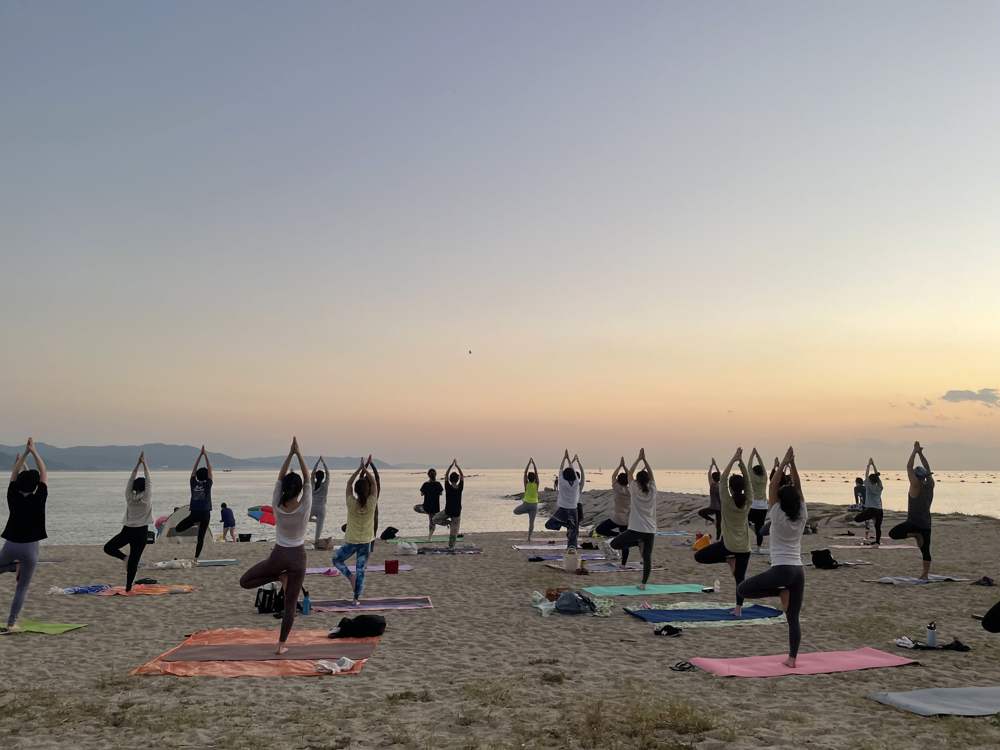 対岸に淡路島、東に明石海峡大橋がある広大なロケーション。白い砂浜が続く見晴らしの良いビーチ、波の音を聴きながらおこなうヨガは、開放感にあふれます。時間により変化していく景色をお楽しみいただけます。