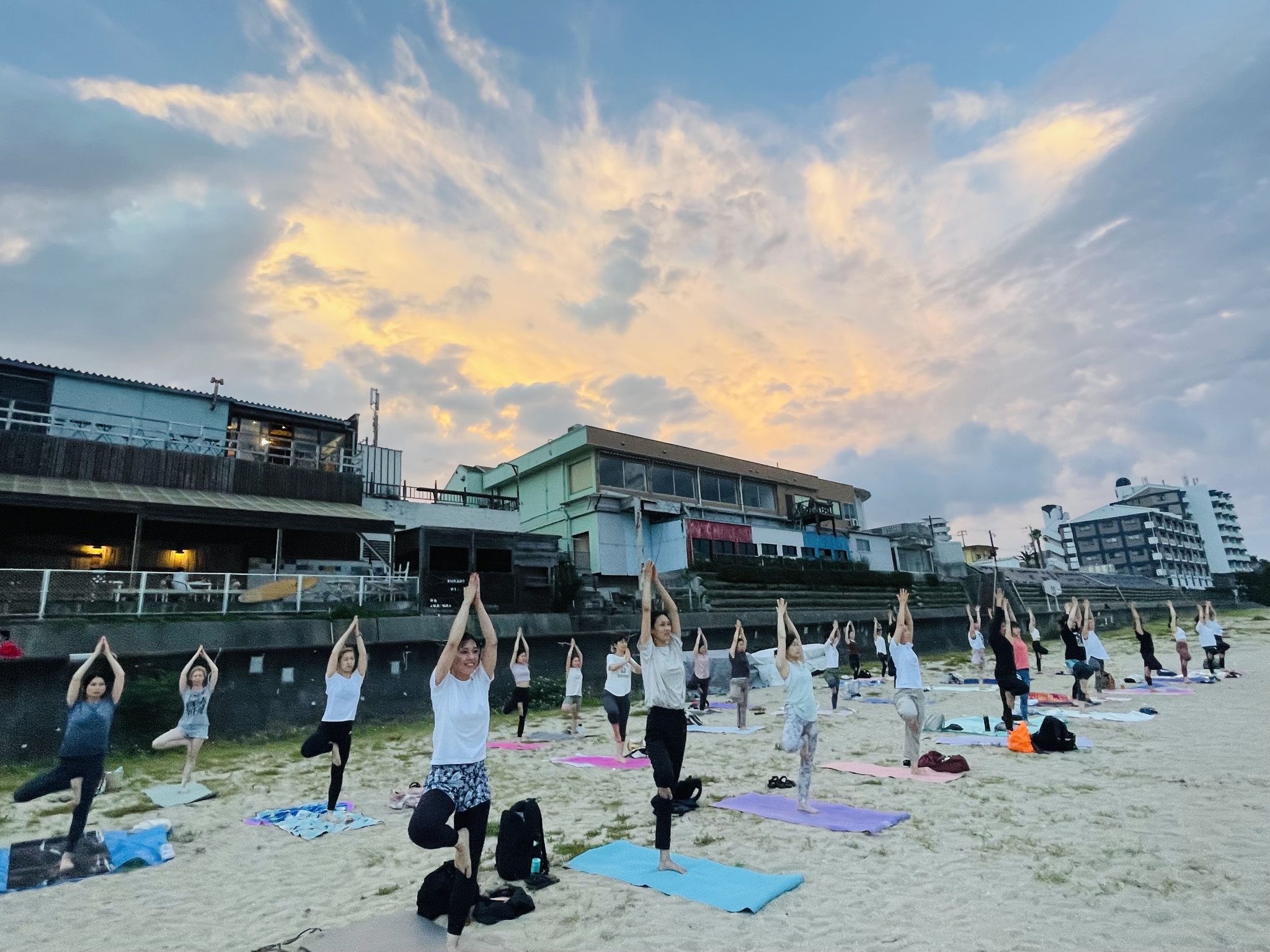 透明度の高い海、広い空を眺めながら、砂浜で行うヨガ